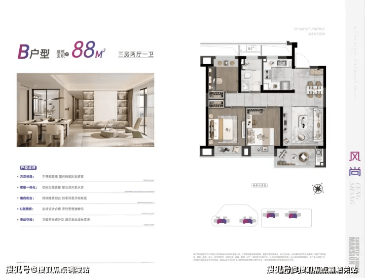 特点:紧凑三房布局,三开间朝南,客厅面宽约 3.6 米,衔接南向阳台,采光通风俱佳。U 型厨房操作动线高效,餐厅与客厅相连,空间通透不压抑。主卧带飘窗,次卧与书房灵活改造,满足三口之家或二胎初期需求。