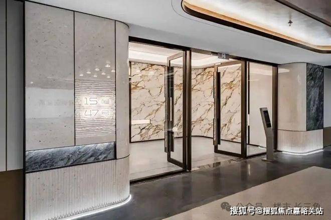 入户大厅的部分外墙上也采用香槟金与部分灰色石材,门头雨棚采用香槟金色弧形装饰,搭配大玻璃面,尊崇感呼之欲出。