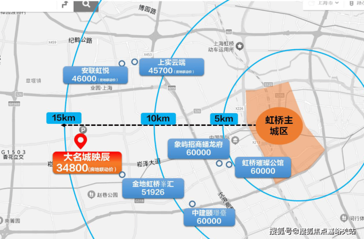 将视野拉大,在青浦,向东赵巷皆5万+/㎡,向西青浦新城、淀山湖大道也都4.5万+/㎡。
