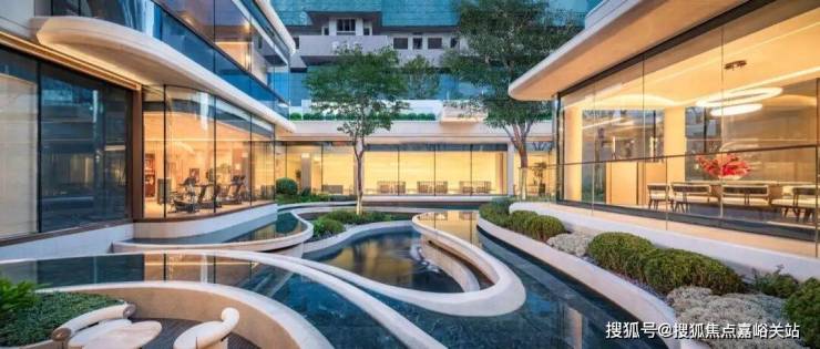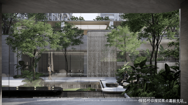 下沉式庭院,通过垂直景墙、悬浮观景台与叠水景观的立体交织, 实现移步换景的视觉效果,也与会所空间形成无界交互。