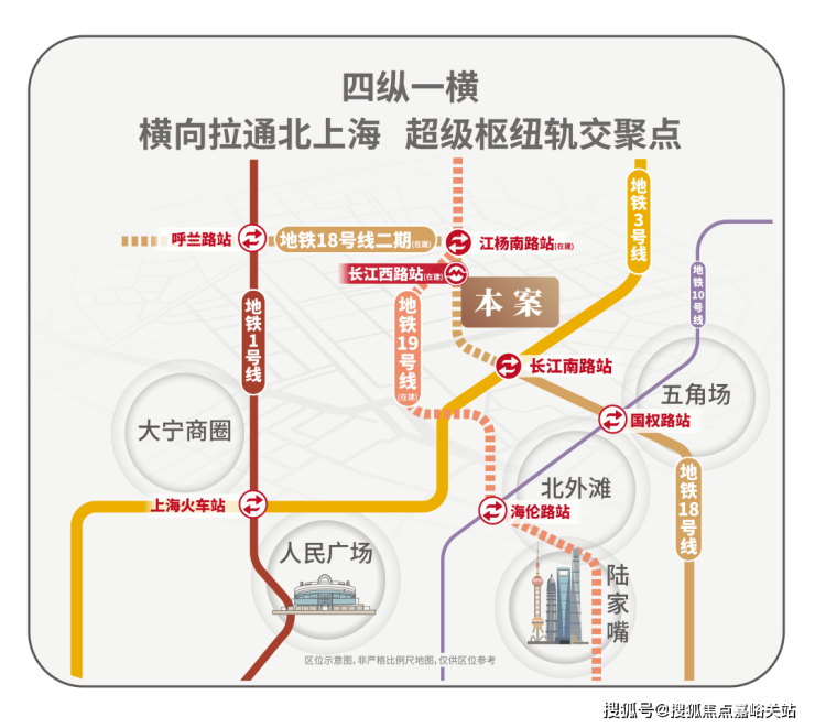 北上海轨交聚点 • 中环之上奢居新地标: 地铁18号线横向拉通了原本纵向不相连的四线地铁:1/3/18/19,将北上海横向联通,成为区域轨交的交汇聚点;项目紧邻长江西路地铁站(直线距离约150米),1站江杨南路,5站复旦,7站五角场。