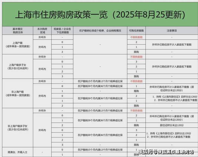 非沪籍居民家庭/单身人士:社保/个税满1年可在外环外不限购;满3年可在外环内限购1套