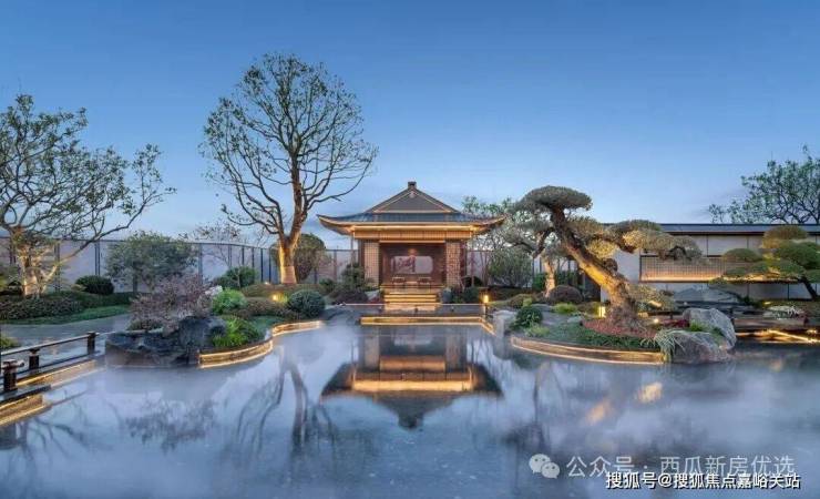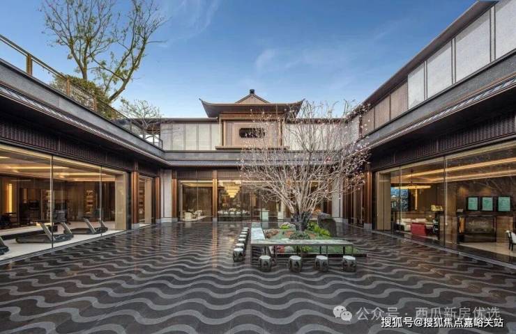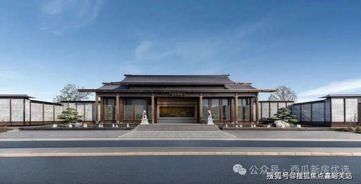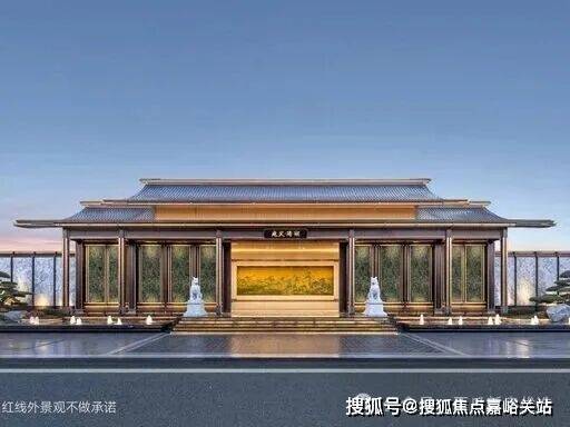 威仪门庭:约75 米宽新中式大门,取意《瑞鹤图》飞檐形制,非遗漆画《千里江山图》点缀,归家仪式感拉满。