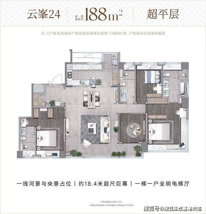 3. 188㎡ 五房两厅三卫(楼王平层,950 万起)