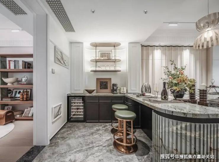更好更奢的归家门庭,嘉佩乐酒店风格,海派元素充满空间的每一个角落,地面的复古花纹,金属镂空装饰墙,普拉达绿的奢石点缀,仿佛穿越到了摩登时代。