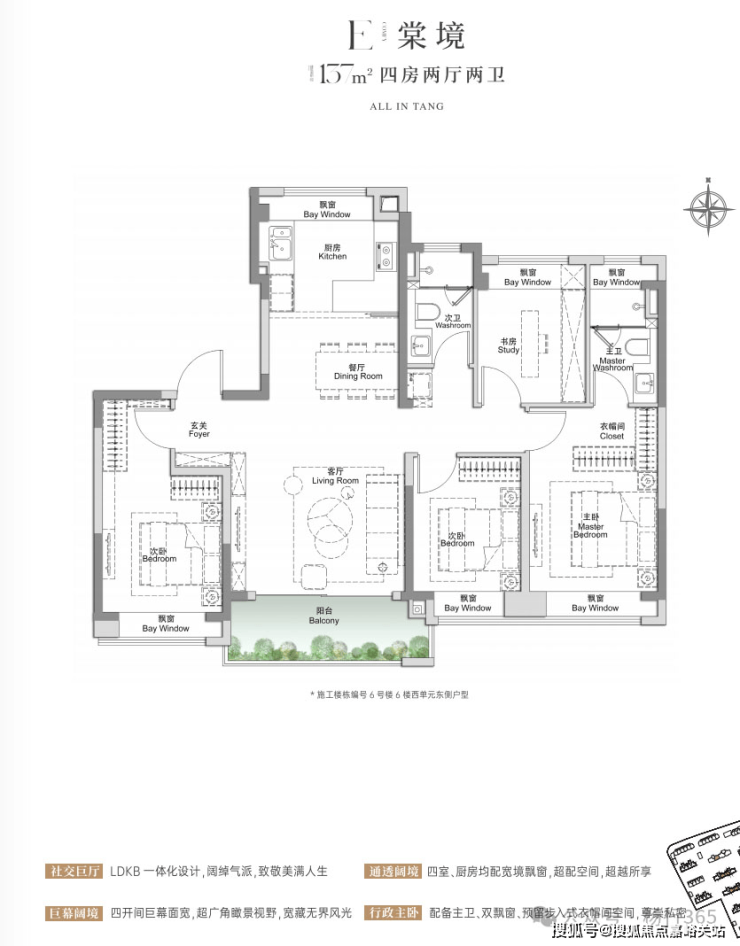建面约105㎡3房2厅2卫,做到了三开间朝南+4个飘窗+双面阳台系统+主卧套房设计+270°转角飘窗,该户型的居住体验、舒适度、尺度感,是同级别产品所无法比拟的。