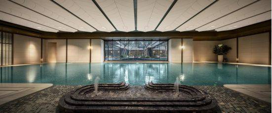 恒温泳池:第一,采用了景德镇烧制的陶瓷马赛克,独特的釉面色彩由景德镇老师傅手工浇筑而成,充满人文艺术底蕴;第二,羽毛天花造型,由600余件铝板打造,表面采用了仿贝壳纹的艺术漆处理,带来松弛度假感;第三,不仅配置了约25m×10m的4道泳池,还采用了奥运会同款空调除湿系统,彰显高档品质细节!