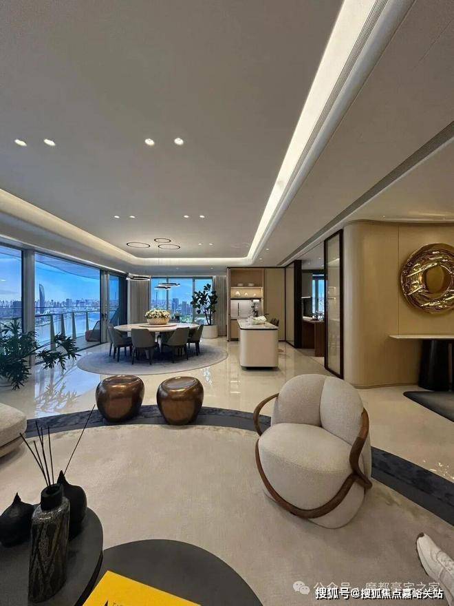 客厅空间采用大量造价昂贵的弧面设计,带来更有格调的审美价值: