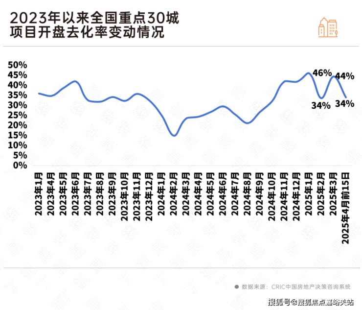 据CRIC监测数据,4月上半月重点30城项目开盘去化率为34%,与2025年2月全月持平,较2025年3月全月下降10个百分点,与2024年4月全月相比增长10个百分点。