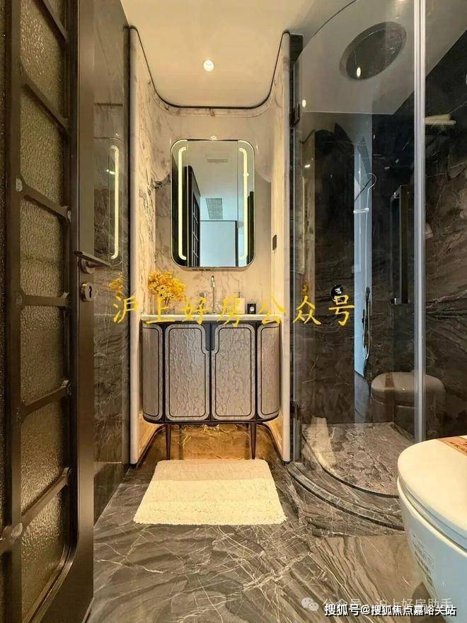 电视背景墙选用意大利超白洞石材;卫生间台面及墙面采用芬迪白;来自巴西进口的静雅棕石材在有些顶豪中仅用于卫生间点缀,而在绿城黄浦ONE,则将其大量运用于地面铺装