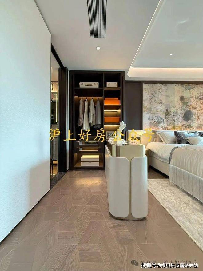 同时项目首创的“艺术柜体”,把艺术家陈亮的“大山水”作品镶嵌在橱柜门把手上;主卧背景墙更是定制款画作与高级木饰面的巧妙拼接