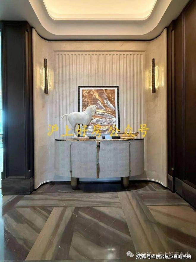 例如入户玄关铺设有“石材皇后”鱼肚印象”,这种级别的奢石在很多顶豪项目中通常仅作局部镶嵌