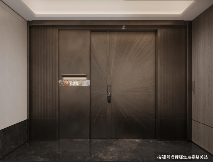 比如入户大门配备大面积的金属格栅、局部莫奈奢石。