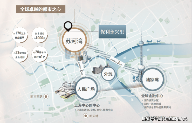 距离市中心人民广场距离仅约2公里,苏河湾商圈直线距离约900米,距离北外滩直线距离约700米,距离大悦城商圈约1公里,市中心最便捷、最繁华、最热闹的配套。