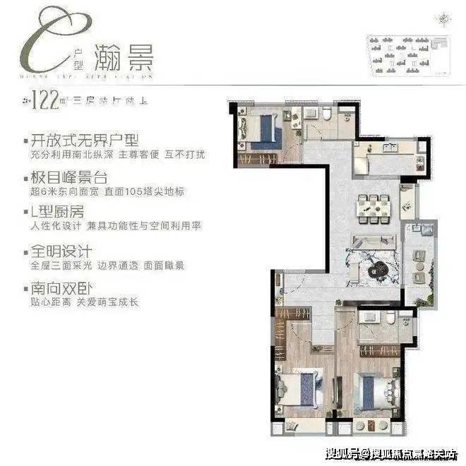 120平米双面宽版开放式交友户型,大尺寸景观阳台直面东侧地标,主客卧分开,保障隐私。