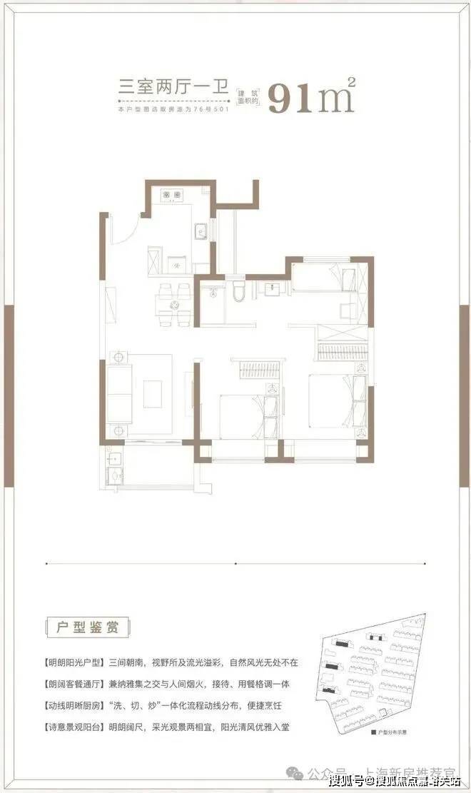 建面约91㎡3房2厅1卫户型,做到了 三开间朝南+双朝南卧室带飘窗+动静分离+卫生间干湿分离,采光面拉到极致的小3房户型。