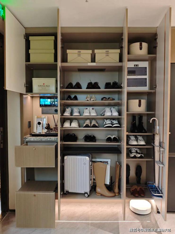 并且,玄关柜和鞋柜的部分做了非常多的功能分区设计,小到隐藏的穿鞋凳、伞架和扫地机器人,大到除臭精灵、长靴、行李箱,都能放进这个空间内。