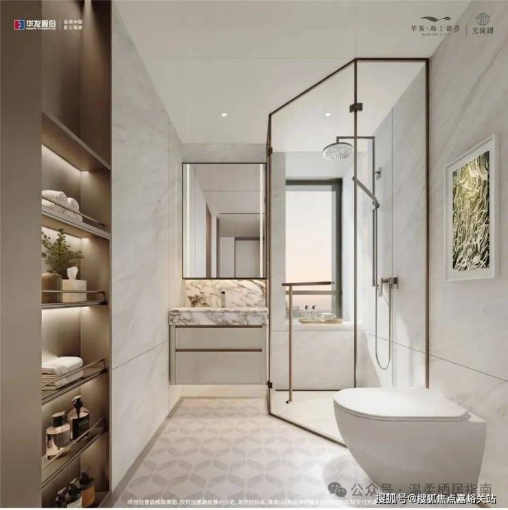 【卫浴系统】主卫恒温水阀搭配顶喷花洒,大理石防滑地砖与长条形地漏完美结合,公卫薄墙移门(不包括I户型)、淋浴区壁龛、一体式新风组合,主客卫双配智能马桶,静享高进阶卫浴系统时光。