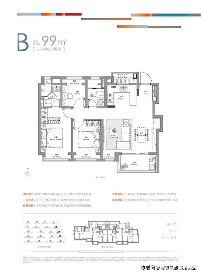 建面约99㎡B户型客餐厅配置超大尺度横厅,全卧室飘窗就连主卫也配置了一个飘窗