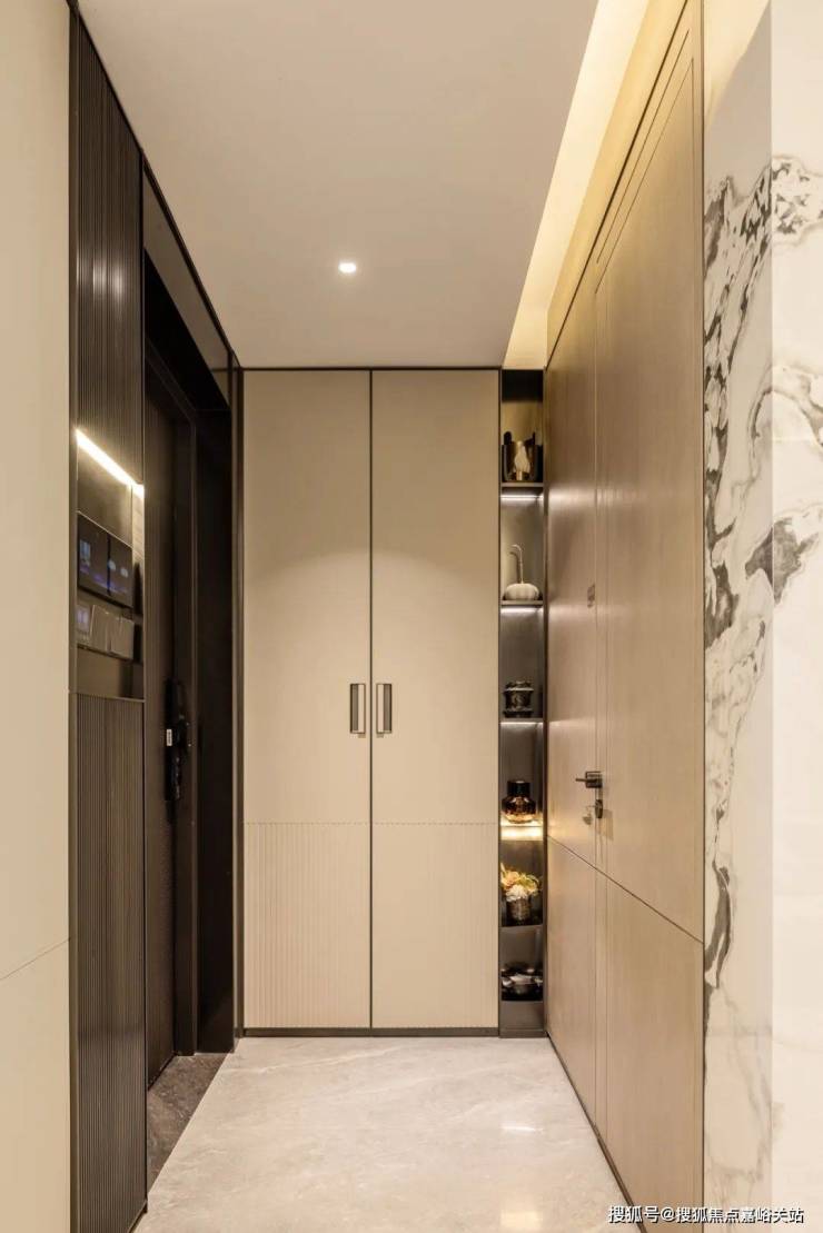 以主打的 建面约100平米3房2厅2卫为例,进入样板间,首先映入眼帘的是设计感满满的 入户玄关轻卡门手感厚重,搭配 飞利浦智能锁高端系列产品,品味与安全感相得益彰。门后的 定制柜巧妙设置了 玄关造景金属壁龛柜及女王高靴放置区,实用且大气美观,让归家的第一步就充满温馨与尊贵。