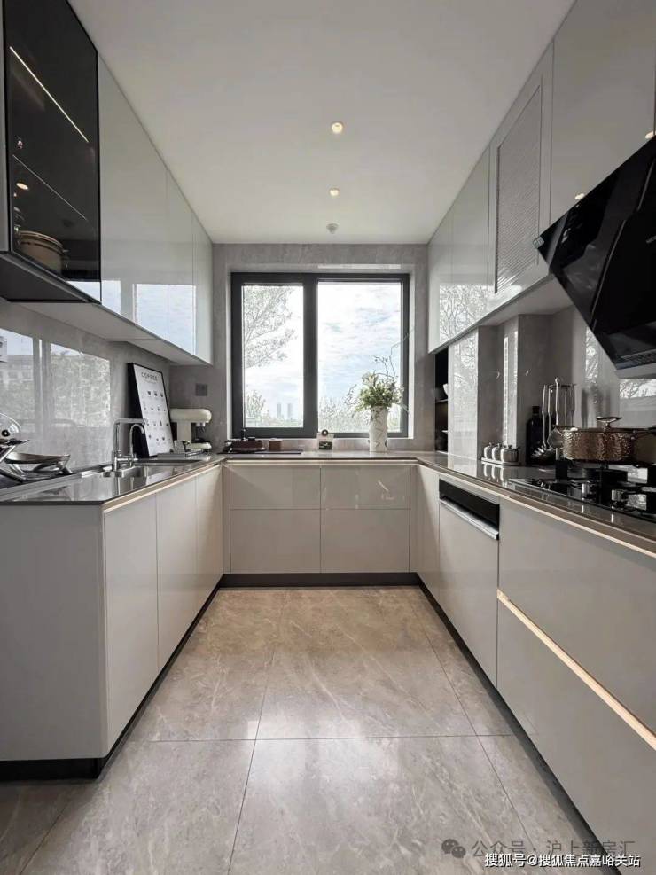 U型厨房:厨房采用 U型布局,并巧妙融入飘窗元素,拓宽视野同时增添休闲氛围。