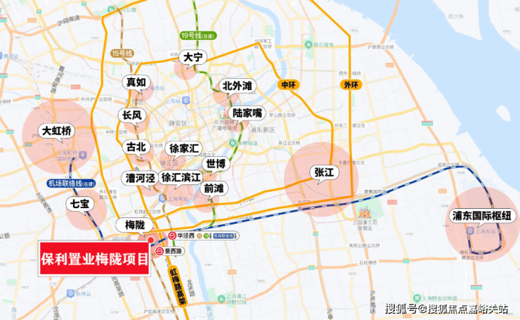 你看梅陇,15号线(已通车)、19号线(在建中)、机场联络线(即将通车)3轨交汇。再加上虹梅路高架直插中环外环,南侧银都路越江隧道2024年年底建成后,可直通“浦东金色中环”。
