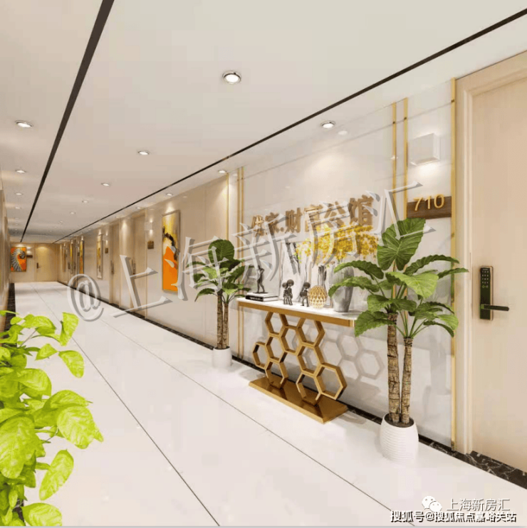 廊道墙面采用高级天然大理石-洞石、高级墙板、玫瑰金不锈钢,地面采用米色天然大理石