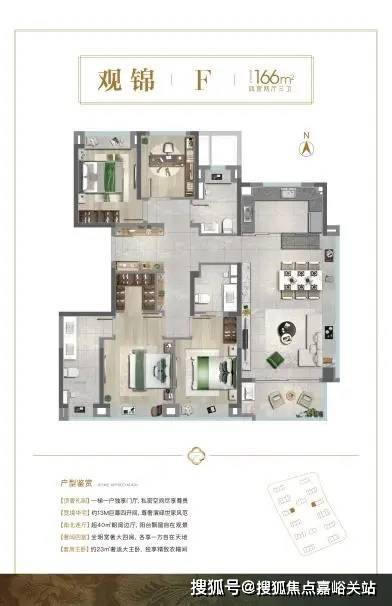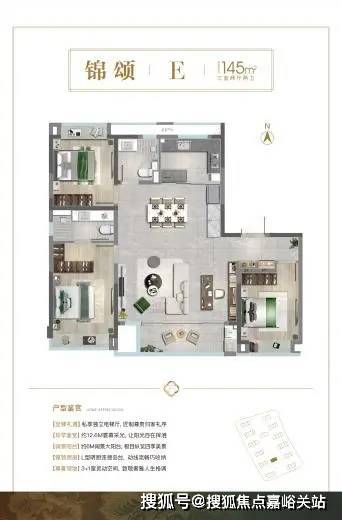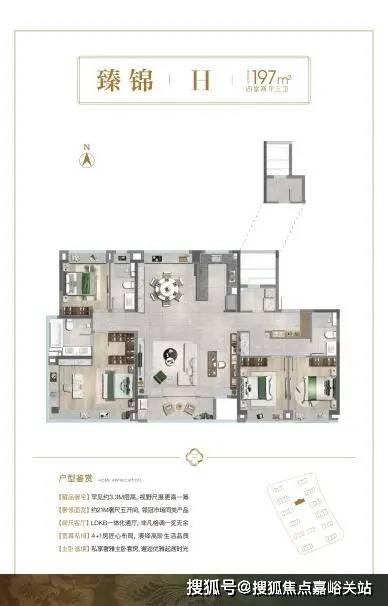 南向3.5面宽边厅的户型设计,一梯一户的电梯厅基本可以独享;客餐厅一体化设计,270°的超广视角,居住者足不出户就能坐拥长卷式观景体验;南向双套卧设置,实现精致而又尊奢的世家生活风范。