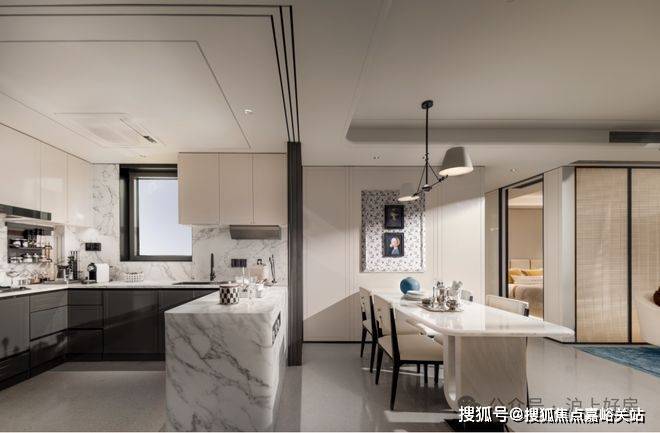 厅内空间充裕,既容得下大家庭聚餐的超大圆桌,也有独立西厨岛台,满足高净值家庭多元烹饪需求。