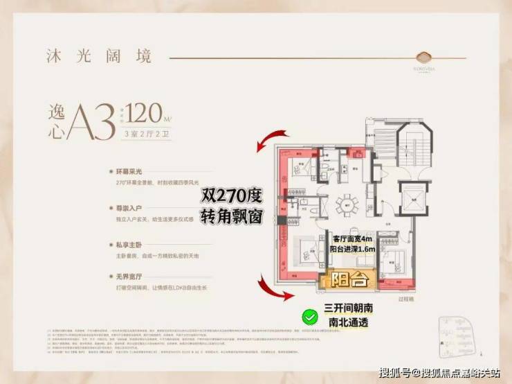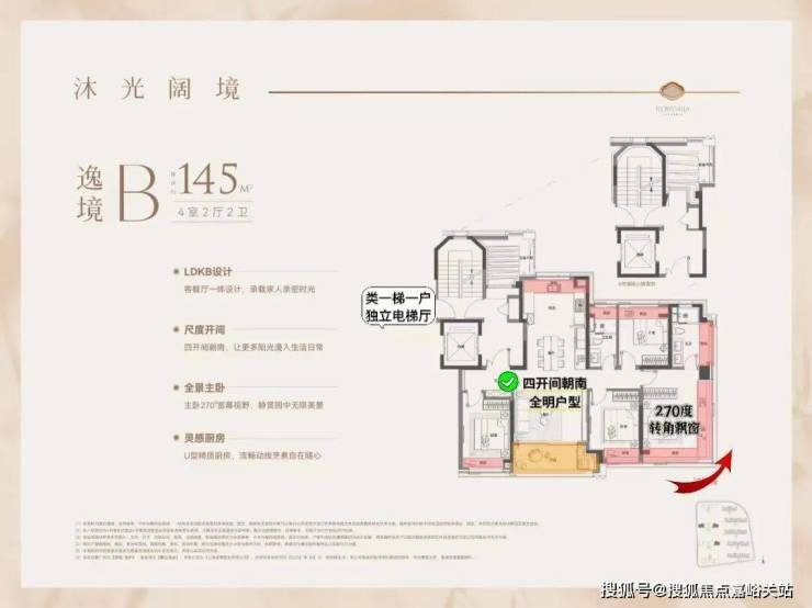 这个户型全部是类一梯一户独立电梯厅设计。四开间朝南+南北通透+全明户型+270度大飘窗,改善户型的终极之作!无论是四口之家还是三代同堂,尺度都能完全容纳。
