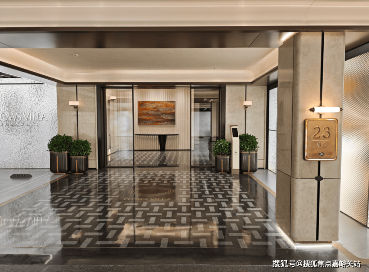 首先是小区南侧的次入口,进门第一个最吸引人的地方就是玉石照壁,75片珍贵的玉石用金属拼接起来,寓意着「金玉满堂」。