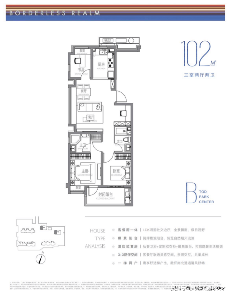 建面约102m²户型特点:LDK洄游式景观边厅,景致拉满,3+X陪伴空间,承载更多自定义功能需求,开放式厨房,烹饪与客餐厅无界互动。