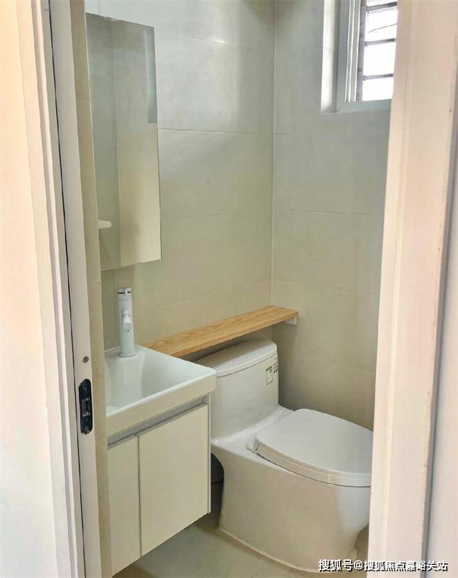 洗手池做一体陶瓷盆,放在角落不仅不碍事,还能通过洗手柜+镜柜的布置,收纳下各种清洁护肤用品,让明面上保持净空状态。