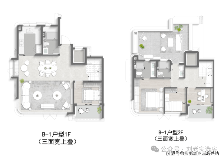 再来说项目的 叠墅产品 :约 9.5 米南向三面宽、 独门独户 、约 6.1 米地下室挑高(下叠)、 超大露台 (上叠),可以说, 将墅居的尺度感和扩展空间拉满!