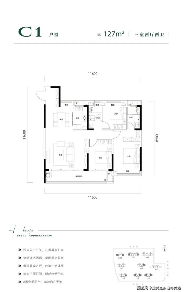由9栋20-26层的高层组成,住宅容积率仅约2.5。在售建面约98㎡、110㎡、127㎡、140㎡四个户型,层高3米,远高于目前市面主流约2.8米。