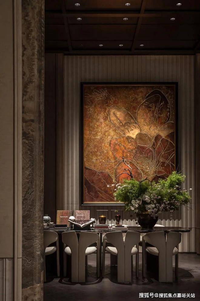 王府规制的通高大门,镶嵌昂贵天然水墨玉,自然天成的“山水画”,传递“玉出东方,门纳乾坤”的美好寓意;会客区域非遗艺术家画作《繁花映春》,耗时3月而成,诠释历久弥新的艺术价值。
