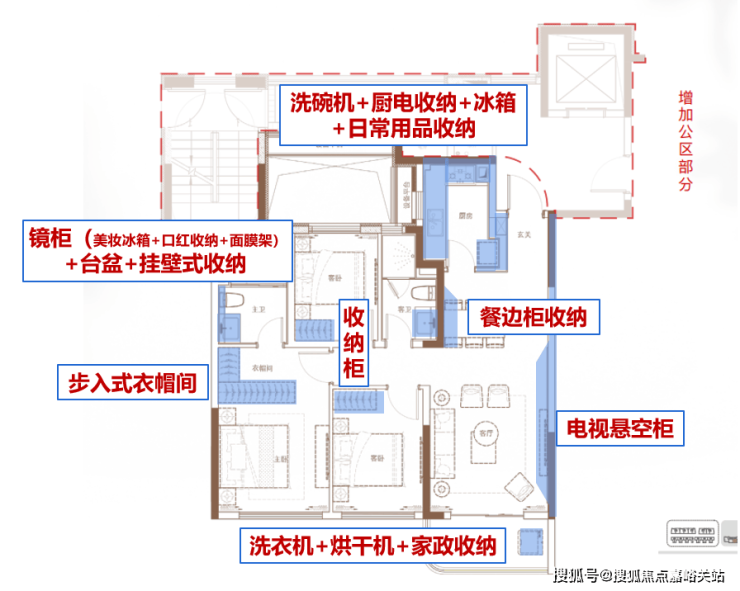 1、精细化收纳系统:全场景收纳,卫生间镜柜内含美妆冰箱、房门后有家政收纳空间、厨房的小家电区、衣帽柜收纳等等,这些一起解决了家庭的大部分收纳问题。
