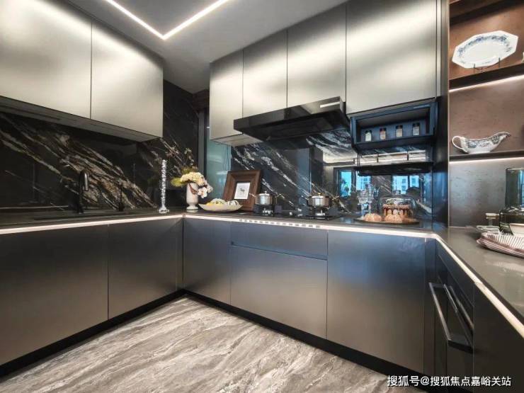 餐厅边做了一个超大的U型厨房,整个柜体都用的金属材质光感.厨电采用了博世四件套的配置.