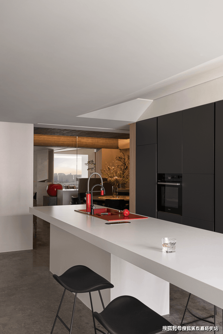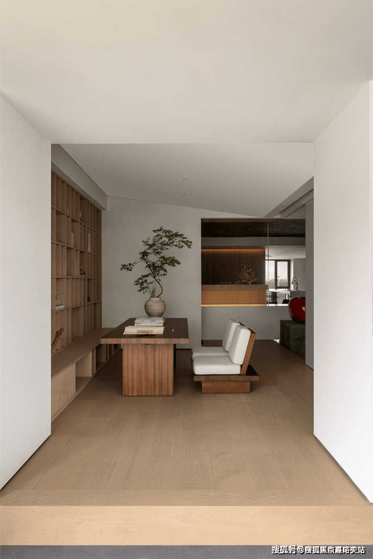 一层主要作为会客功能。样板间将一楼书房空间打开,与餐厨空间相连,更显空间感,推门就可独赏自家院中美景。 还贴心设计了一个父母房,方便老人起居。