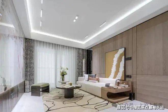 客厅背景墙岩板,客厅采用金属踢脚线,提升整体质感;华发虹桥四季售楼处电话:400-856-9058☑️☑️