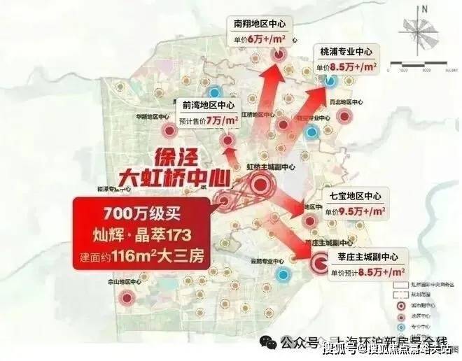 据销售人员透露,灿辉·晶萃173的总价在700-1000万左右,116㎡改善大三房总价700万级。而同样700万,只能买七宝、莘庄、桃浦等板块的90㎡紧凑户型,或者买南翔、华漕的100㎡户型。这些板块比起徐泾如何?