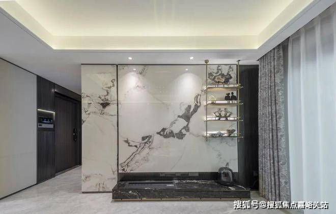 金茂定制壁布/墙纸:结合 芬迪白岩板打造的客厅背景墙,营造独特的归家氛围。