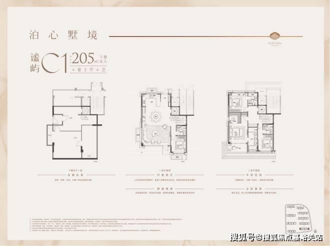 户型特点:下叠边套,南向面宽约9米,客餐厅同宽约5.8米,空间开阔。一楼设南向卧室,采光好且视野佳。二楼为三套房+主卧总统套房设计,主卫南向,可容纳浴缸和双台盆。地下室方正,附赠采光井,利用率高。