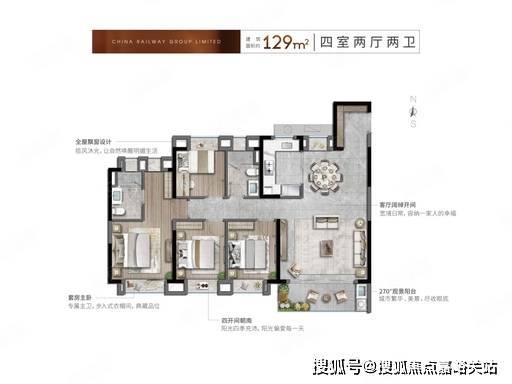 3)129㎡四房两卫|改善明星,382 万起,四开间朝南 + 6 飘窗