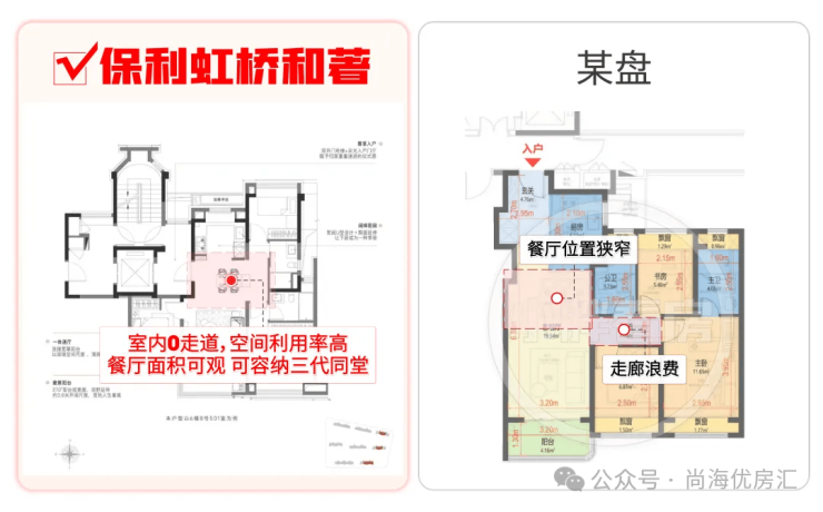 先说户型:如果你熟悉上海市场,你会发现目前市面上的户型普遍会面临:利用率低、收纳空间少、有连廊、卫生间少/功能性差、卧室太小不够等问题。但保利虹桥和著的建面约104㎡3房2卫,却很好的解决了以上所有问题: