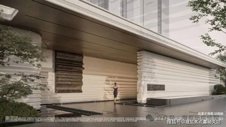 5、领创归家礼序: 约58米月光米黄石材门头,搭配瑰丽酒店同款专属门牌徽章以及名木羽毛枫,打造厚重而温润的名家门仪;