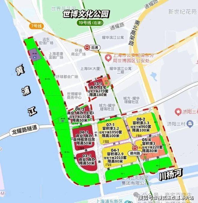 浦东新区上钢社区Z000101单元07-1地块位于世博后滩“九宫格”,距离黄浦江约400米。地块占地面积39577方,容积率3.2,总建面126646方。拟建9栋高层,主力户型约225-280㎡江景大平层。