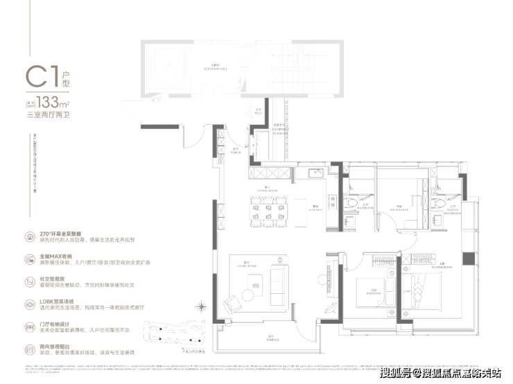 133㎡可以说是108㎡的进阶款,同样的三房两厅两卫,大面宽横厅、半开放式厨房设置岛台,加上主卧L型飘窗,再一次验证了华润置地豪宅化的产品思路。