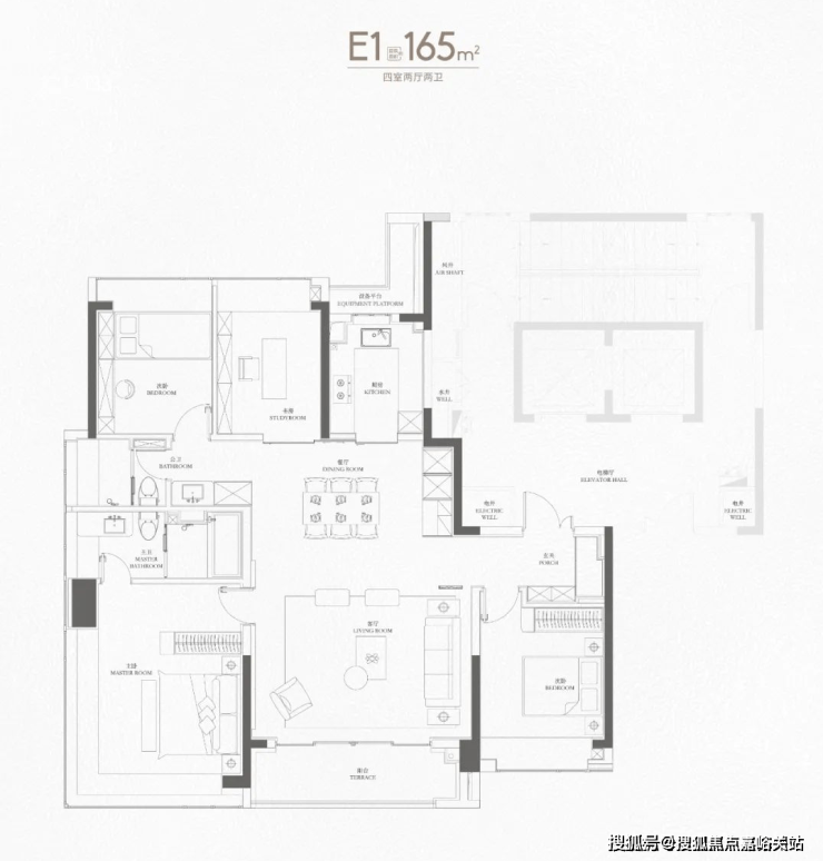 来到165㎡个户型,已经上升到上海主流的大户型改善面积段,但看设计思路,可以看出是为满足多胎家庭成长而服务的。