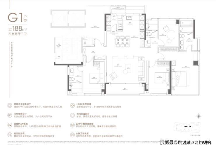 188户型2梯2户,有独立的电梯厅。4房3卫设计,还是3明卫,这两点还是不错的。